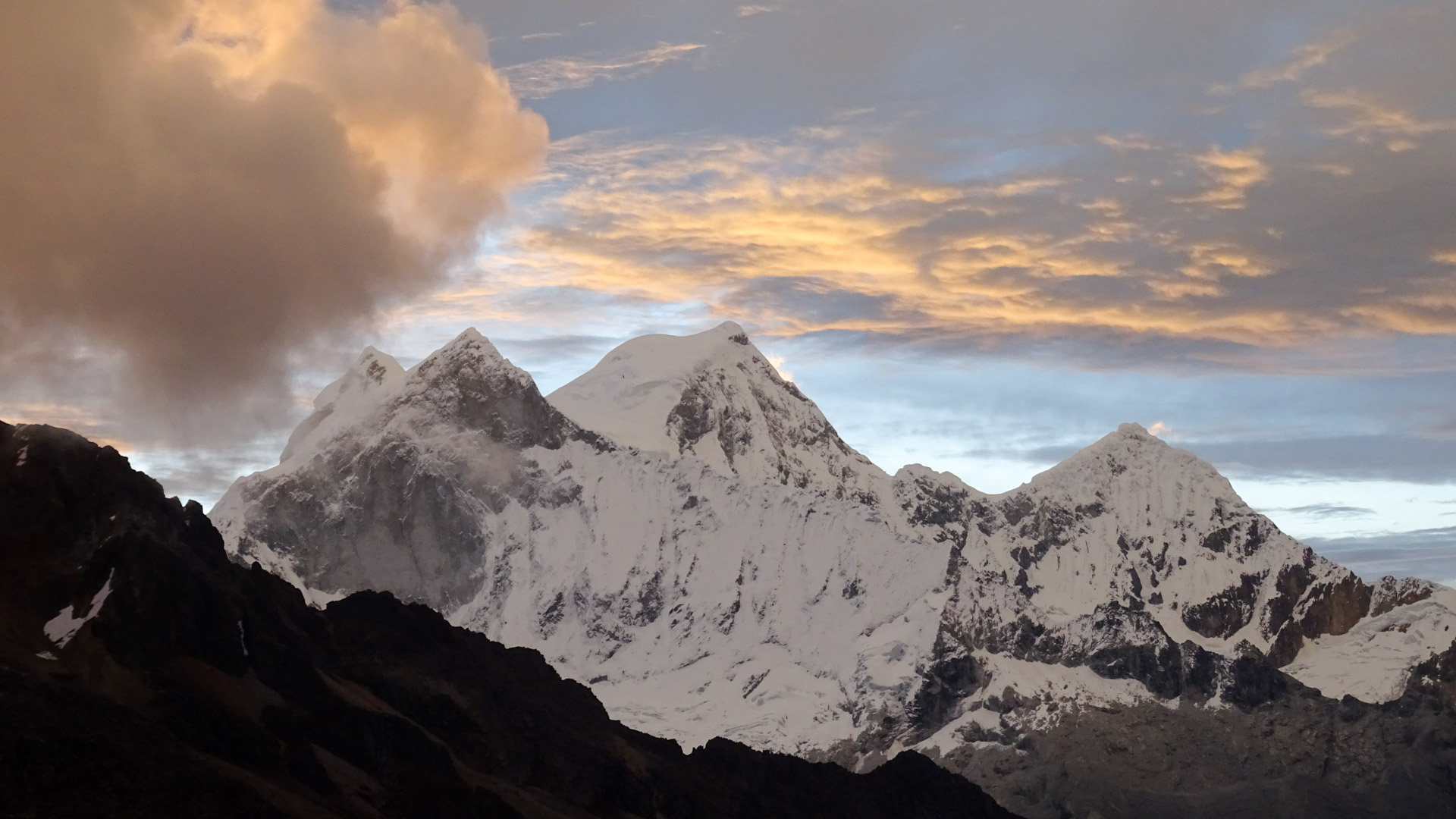 Nach der aufregenden Autofahrt nach Cebollapampa stiegen wir gemütlich zum Basislager auf 4350 auf. Dort bekochte uns unser Koch Julio in gewohnter Manier mit einem fantastischen drei gänge Menü. Am nächsten Tag stiegen wir ins Moränenlager 5000m auf und genossen die einzigartige Abendstimmung. Voller Vorfreude ging es am nächsten Tag ins 5600m hoch gelegene Hochlager. Julio verköstigte uns wieder hervorragend, so dass jeder seine Energiespeicher wieder voll auffüllen konnte. Nachmittags fing es wie gewohnt wieder etwas zu schneien an, aber dies tat unserer Zuversicht keinen Abbruch. In der Nacht zum 11.05.2017 ging es los. Wir starteten bei sternenklarer Nacht und hochmotiviert. Über zahlreiche Spalten und Steilaufschwünge gelangten wir zu einer exponierten Querung, danach wieder steil hinauf in ein Flachstück welches zum Gipfelhang führt. Der Ausblick war hier schon atemberaubend. Voller Vorfreude wühlten wir den Gipfelhang hinauf und waren oben auf 6354m angekommen vor lauter Glück den Tränen nahe. Wir umarmten uns und genossen den einzigartigen Ausblick von dem man nicht genug bekommen konnte. Dann ging es etwas müde aber voller Stolz wieder hinunter ins Hochlager. Dort verbrachten wir noch eine Nacht bevor wir wieder nach Cebollapampa abstiegen und nach Huaraz zurück führen. Am nächsten Tag in Huaraz genossen wir ausgiebig das einzigartige Frühstück im Hotel Churup. Am Vormittag kauften wir noch die letzten Geschenke für Zuhause ein. Dann waren wir bei Erics Familie zu einem traditionellen Peruanischen Essen eingeladen und am Abend ging es zum Feiern. Das Essen ist einfach spitze in Peru und feiern kann man in Huaraz auch ordentlich. In den Clubs wird Salsa getanzt. Philipp war der einzige der diese Art des Tanzens perfekt beherrschte. Wir zappelten kreativ und wild im Salsa Rhythmus in die Nacht hinein.