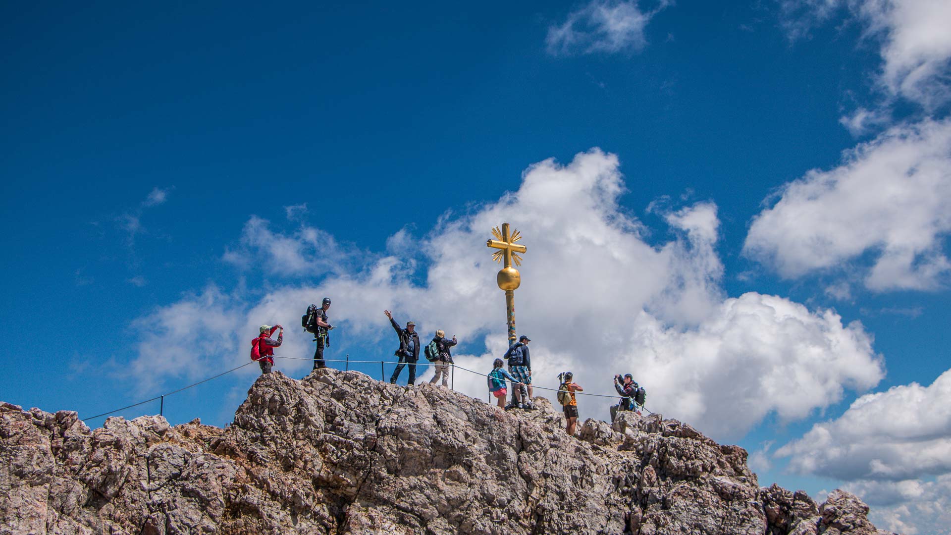 Sehr früh starten wir heute und setzen unseren Weg in Richtung Zugspitzgipfel fort. Zunächst geht es ein Stück flach weiter, bevor es schließlich lang und anstrengend steil in Serpentinen bergauf geht. An der Knorrhütte (2.051 m) angelangt, haben wir uns eine kleine Pause verdient! Wir verweilen aber nicht lange, denn wir haben heute noch den Gipfel der Zugspitze im Visier. Da wir am Nachmittag zur Knorrhütte zurück kehren, können wir einen Teil unseres Gepäcks hier deponieren und mit leichterem Rucksack dem Höhepunkt unserer Zugspitzwanderung entgegen gehen. Die Landschaft ist inzwischen hochalpin. Über Geröll und vorbei am Schneeferner erreichen wir das Zugspitzplatt (2.570 m). Von hier geht es in einem letzten steilen, teilweise ausgesetzten und mit Drahtseilen versicherten Steig hinauf zum Gipfel der Zugspitze auf 2.962 m. Je nach Verhältnissen und Schneelage weichen wir dabei auf die Seilbahn aus. Bei einer ausgiebigen Gipfelrast genießen wir das traumhafte Panorama, das sich uns hier vom höchsten Gipfel Deutschlands eröffnet. Wir haben es geschafft und stehen auf dem "Top of Germany". Entspannt treten wir am Nachmittag den Abstieg zur Knorrhütte an, wo wir auf unseren heutigen Wandertag anstoßen.