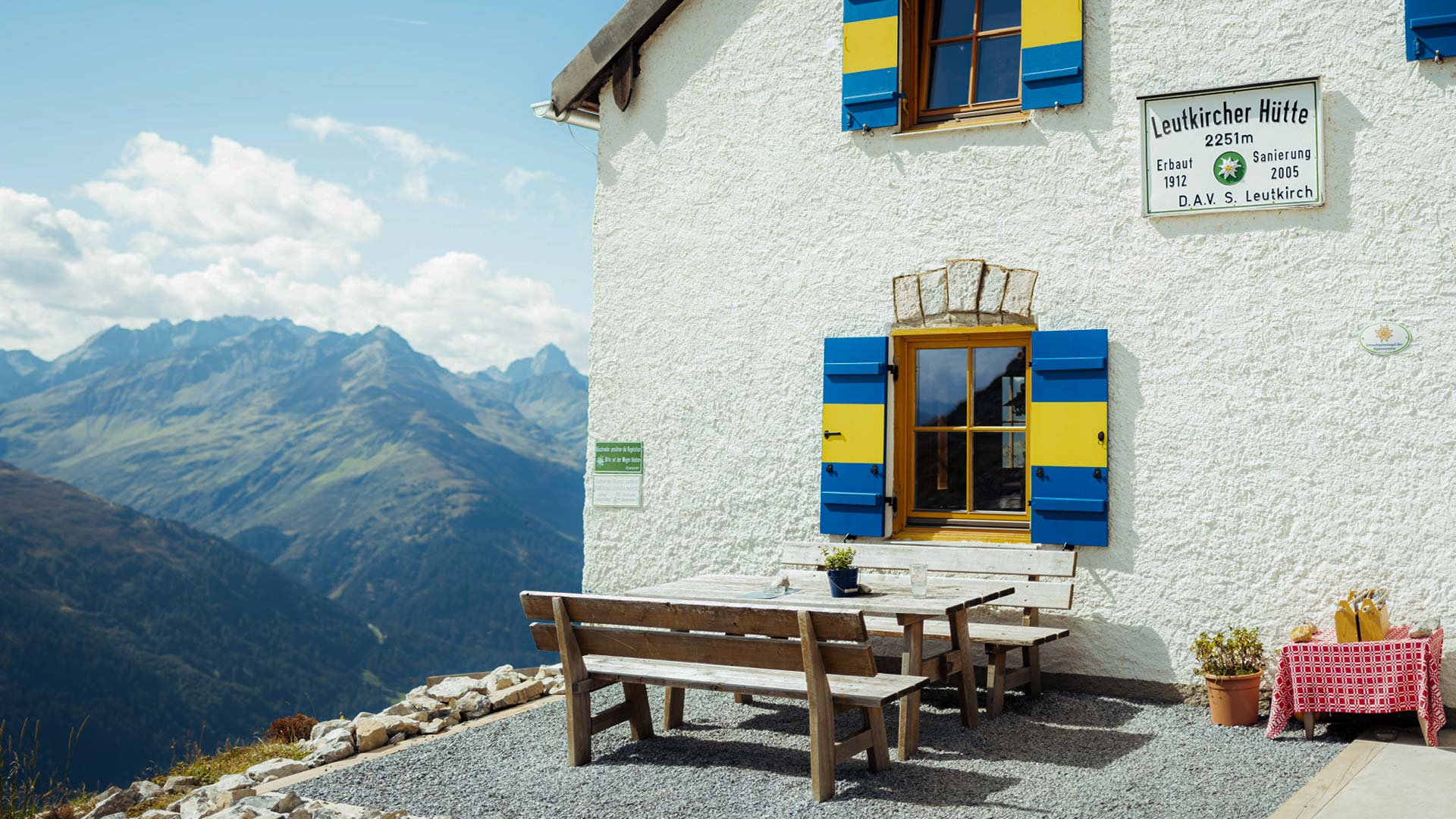Die Leutkircher Hütte wurde 1912 erbaut und blickt auf eine bewegte Geschichte zurück: 1927 wurde eine Hauskapelle mit neugotischem Altar eingeweiht, die bis 1979 bestand. 1945 war die Hütte von deutschen und französischen Besatzungstruppen besetzt. 2009 erhielt sie das Umweltgütesiegel des DAV – eine Auszeichnung für nachhaltige Bewirtschaftung in den Alpen.