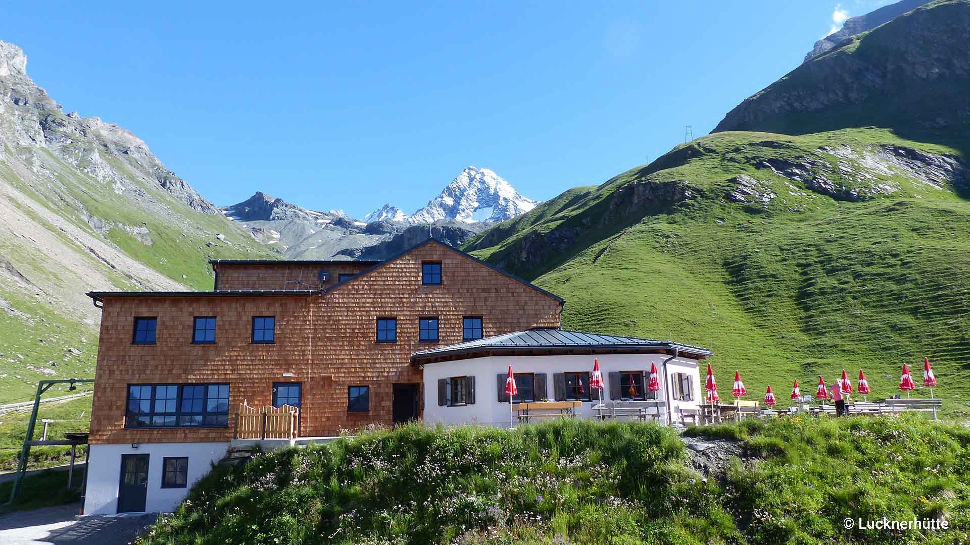 Die Lucknerhütte steht auf 2.241 m direkt am Fuß des Großglockners – dem höchsten Berg Österreichs. Die Berghütte in den Hohen Tauern dient als Stützpunkt für die Hochtour auf den Großglockner (3.798 m). Steinböcke streifen als "Haustiere" ums Haus, während sich über der Hütte die vergletscherte Südwestflanke des Großglockners aufbaut.