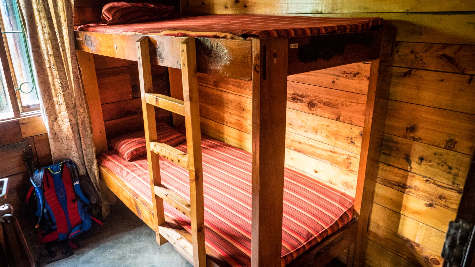 Miriakamba Hütte am Mount Meru auf etwa 2.500 m Höhe mit Vierbettzimmern, verteilt auf mehrere Gebäude.