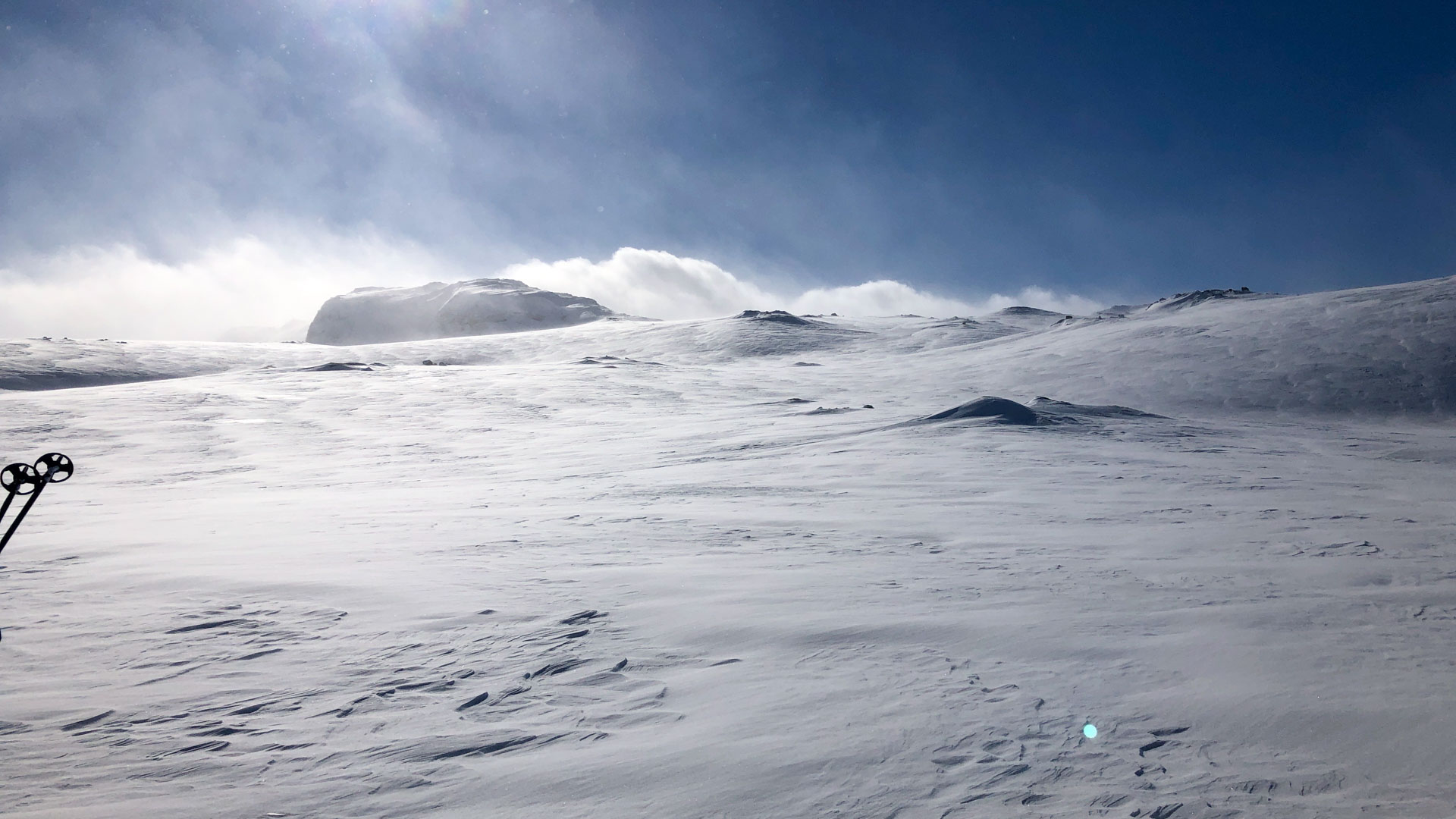 Das Camp war dann auch wieder schnell abgebaut und machen uns auf den Weg nach Finse zurück. Durch die etwa 30 Zentimeter Neuschnee sind die Spuren anderer Wanderer nicht mehr zu sehen, es ist eine jungfräuliche Schneefläche, über die unsere Gruppe zieht. Noch nie habe ich so gerne gespurt: es ist einfach traumhaft, durch den unberührten Schnee zu gehen, den Wind im Gesicht und den immer wieder blauen Himmel vor Augen. Herrlich. Einmal stehen wir an einem wunderschönen Fleck, als von jetzt auf gleich ein Schneesturm losheult - so schnell kann das gehen. Kurz vor Finse dreht der Wind nochmal richtig auf und der Schnee wird uns wie kleine Steinchen ins Gesicht geschleudert. Sehr zur Freude der zahlreichen Snowkiter, die auf dem See vor Finse über das Eis flitzen.