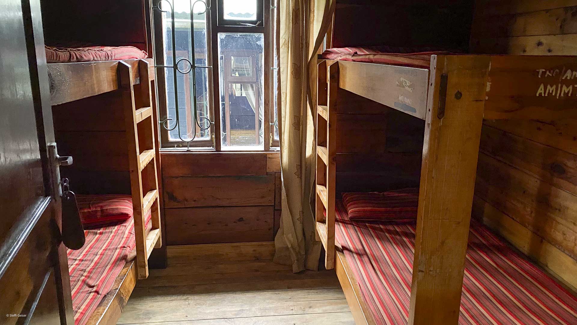 Sattelhütte (Saddle Hut) am Mount Meru auf etwa 3.500 m Höhe mit Vierbettzimmern, verteilt auf mehrere Gebäude.