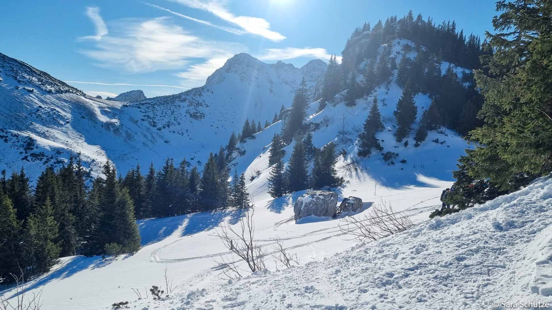 Es geht weiter der Sonne entgegen. Ich lasse meinen Blick über die Bergkämme schweifen und verliere mich in der Schönheit der Landschaft. Träume mich weit weg und bin doch ganz bei mir. Fast schon meditativ lasse ich meine Stöcke in den Schnee absinken, höre nichts als meinen vertrauten Rhythmus und das Klappern der Schuhe. Mir steigt der bekannte Geruch der kalten Nadelwälder in die Nase und ein breites Lächeln zieht sich über mein Gesicht. Wandersglück.