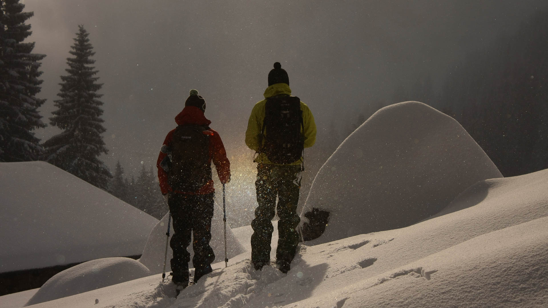 Nachdem ich meine ganz persönliche Ausrüstung zu Hause zusammengekramt habe und stolz darüber bin, den kleinsten Rucksack dieser Welt zu tragen, stehe ich nun etwas planlos in der Landschaft herum: Zur Leihausrüstung gehören neben Schneeschuhen und -stöcken auch ein LVS-Gerät (Lawinensuchgerät), das um den Bauch geschnallt wird, als auch Lawinensonde sowie Schaufel, die im Gepäck verstaut werden müssen. Und zu allem Überfluss ist damit keine Miniaturschaufel gemeint, sondern ein metallisches Instrument, das in jedem Hüttenkrimi die Hauptrolle spielen würde. Mit meinem geballten Tetris-Kenntnissen der letzten Jahren finde ich dann doch noch eine Lösung und bin schließlich abgehbereit - Auf zum ersten Gipfel!